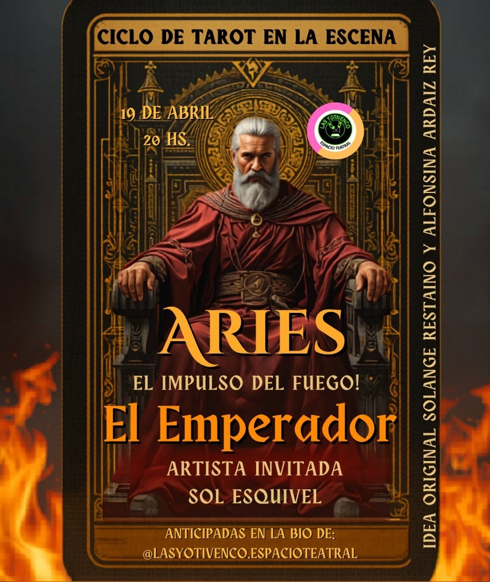 🃏 CICLO DE TAROT EN LA ESCENA 🎭 Episodio 1: "Aries, el impulso del fuego" & "EL EMPERADOR" ♈👑 ¿Cómo nace una obra desde el misterio de los Arcanos? ✨ En este ciclo, el Tarot no es solo una carta: es el motor que enciende la ficción. El escenario se vuelve un tablero donde el azar y el rito se encuentran. Sinopsis: Presenciaremos una creación en tiempo real. A través del juego improvisado y el montaje espontáneo, la actriz Sol Esquivel habita el cuerpo de Aries 🔥 para darle forma al primer impulso. Veremos cómo la estructura del Emperador 🏛️ se levanta frente a nuestros ojos, transformando el movimiento en autoridad y el fuego en escena. 🎬 Un experimento teatral donde las cartas dictan el destino y la actriz se entrega al riesgo de lo inesperado. 🎭🃏 🌟 Artista invitada: Sol Esquivel 💡 Idea original: Solange Restaino y Alfonsina Ardaiz Rey 📅 DOMINGO 19 DE ABRIL 🕗 20:00 HS 📍 Las Yotivenco Espacio Teatral (Estrada 1489) ¡Cupos limitados! No te quedes afuera de este ritual.🔥 Vení a ser testigo de cómo el fuego toma el control del escenario. 🔥